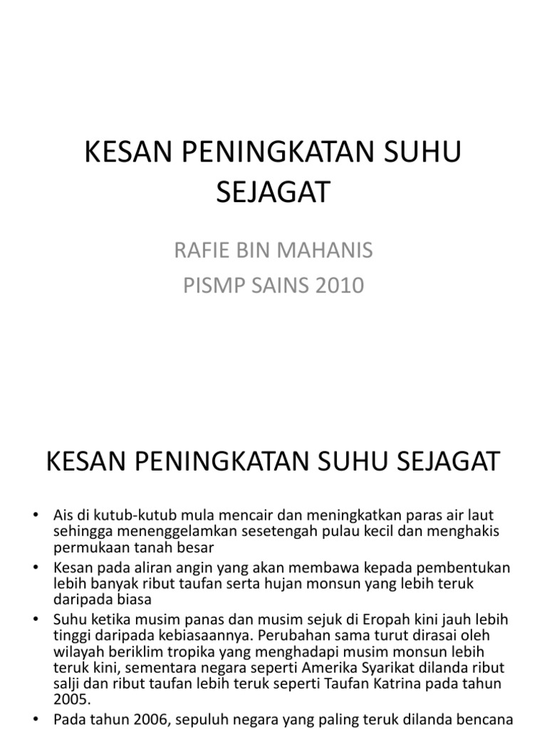 IPCC turut meramal peningkatan suhu rata-rata global akan meningkat 11 hingga 64 C 20 hingga 115 F antara tahun 1990 dan 2100 malah juga memperingatkan bahawa meskipun. Keadaan persekitaran di Malaysia sejak akhir-akhir ini dalam keadaan membimbangkan susulan. Penebangan hutan menyebabkan berlakunya peningkatan suhu kawasan setempat.